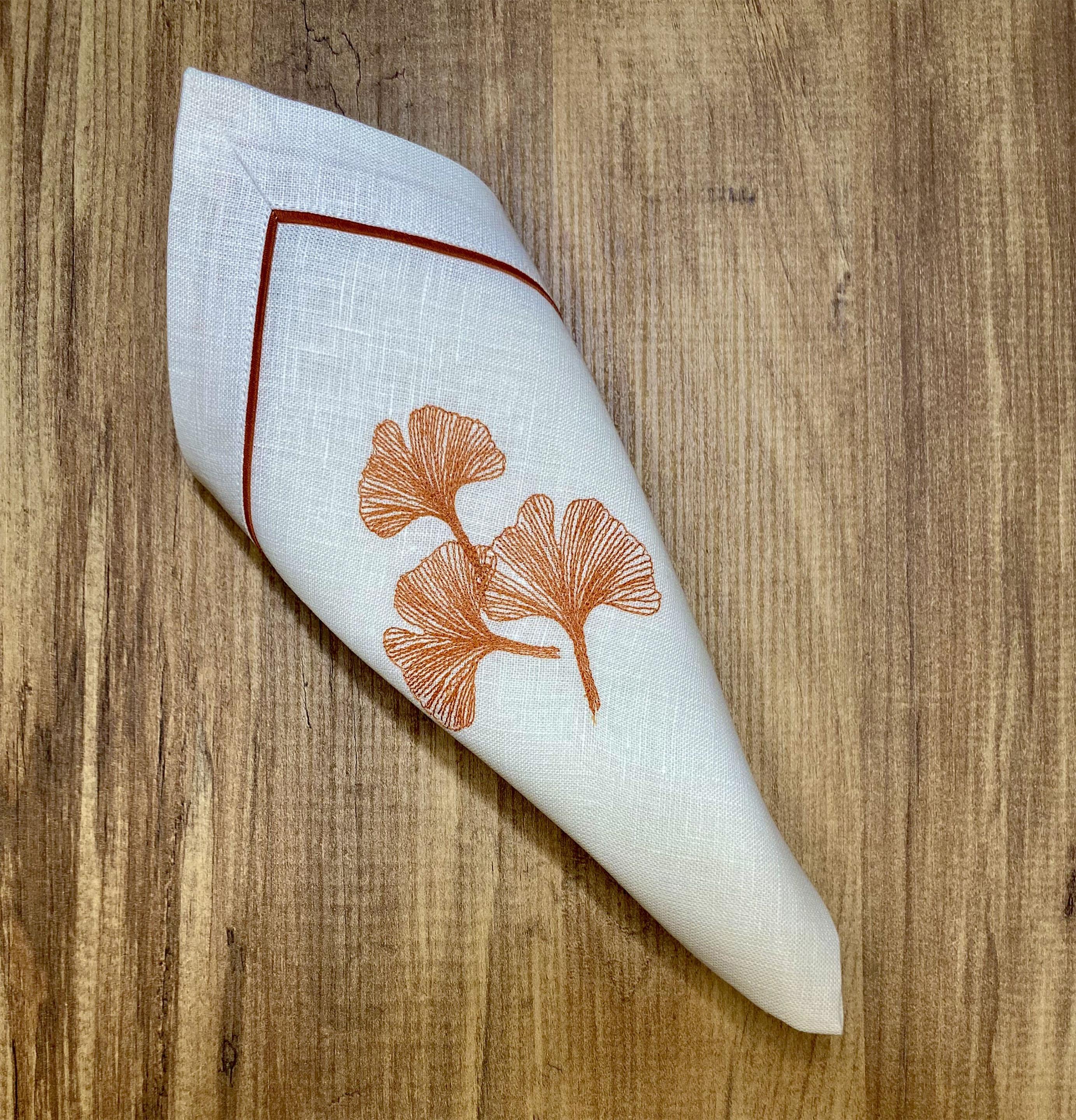 Hem özel hem günlük kullanımlarda kendisine yer bulabilen Gaia Peçete Takımı, turuncu ara biyesi ve ginko nakışıyla öne çıkıyor. Adını; mitolojik hikâyelerde dünya olarak karşılık bulan Gaia'dan alan bu seri ginkoların naifliğini anımsatıyor.