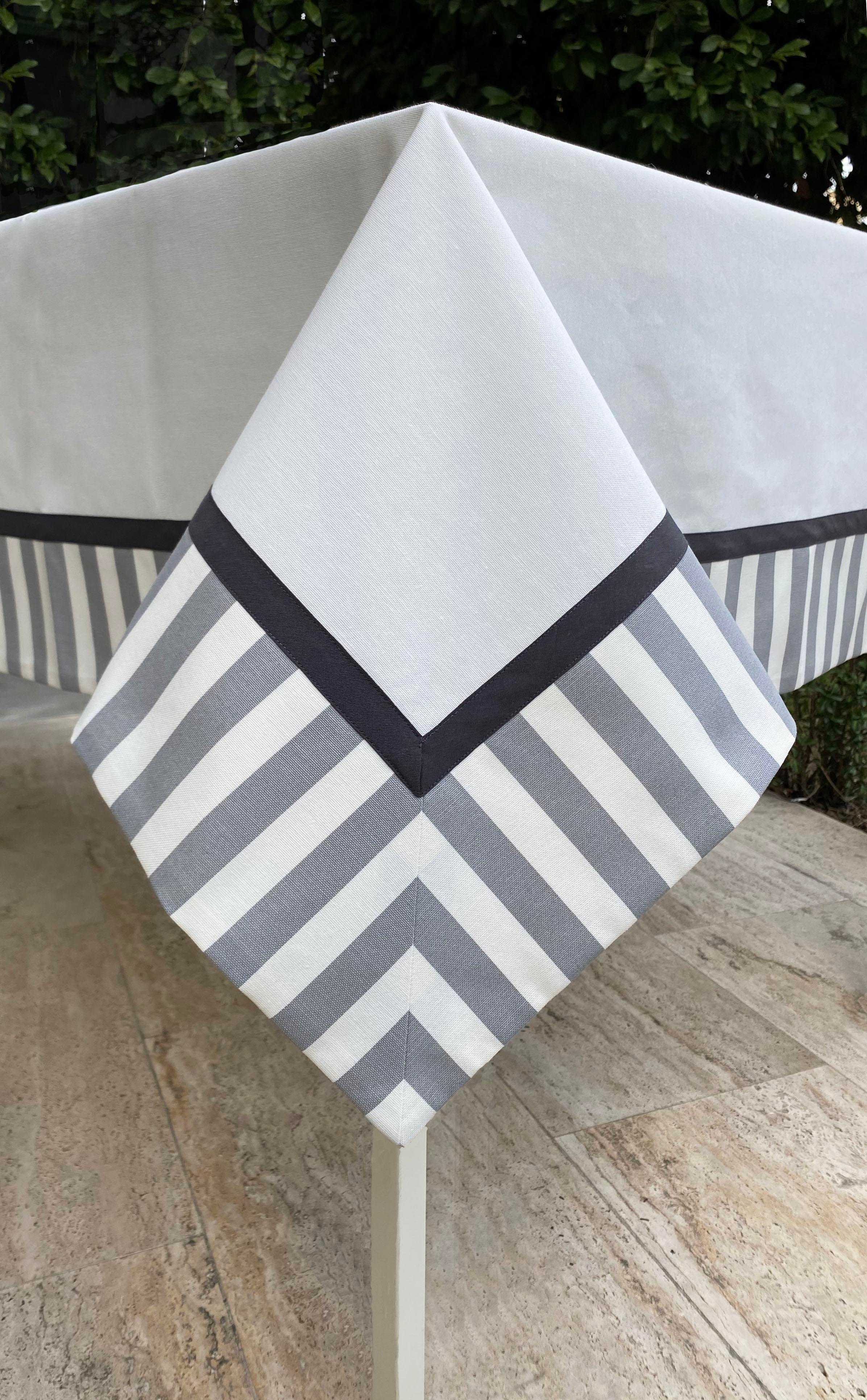 Metron Masa Örtüsü, gri renkteki bordürü ve çizgili kumaş kombiniyle yemeklerin sistemli düzenine göz kırpıyor.
