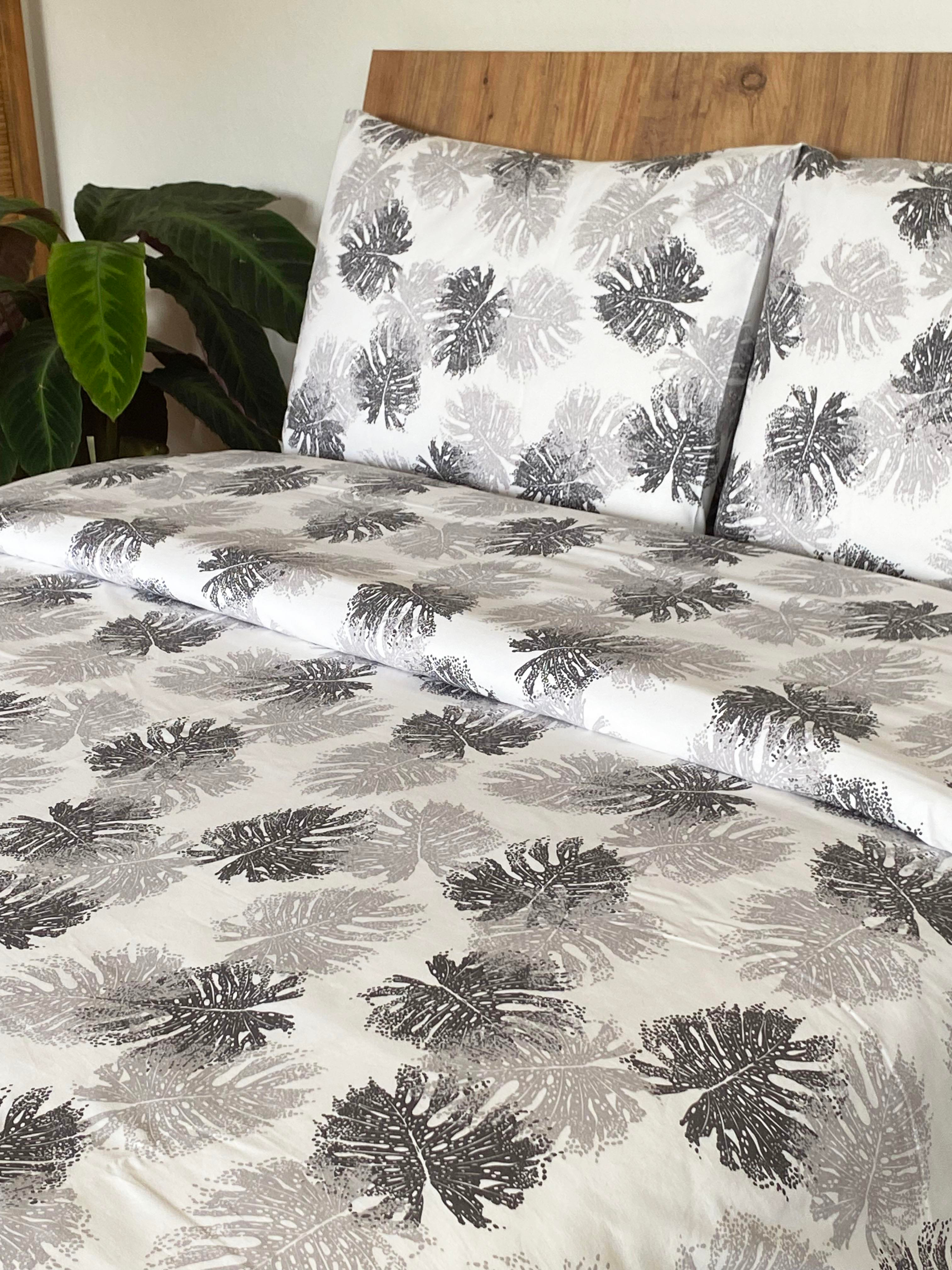 Tropik desenleriyle Palma serisi, grinin birçok renk ile uyum sağlayan tonlarına ve yaprak desenlerine sahiptir. Yumuşak dokusuyla ütü kolaylığı sağlayan bu takım, yılın en sevilen zamanlarını, tatilde olma hissini çağırıyor.